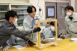 古川工業高電気電子科の1年生37人が4日、同科実習室で、電気工事士と電気配線工事の実習を通して交流した。生徒たちは街のインフラを守るプロの仕事に接し、将来の進路を真剣に考えるきっかけになった様子だった。全国の電気工事組合青年部が展開する「若者の入職促進に向けた業界理解促進交流事業」に基づき、古川電気工事協同組合青年部会(紺野厚部会長、会員数19人)が毎年、同校で実施。10回目のことしは電気工事士の会員8人が訪れた。1時間目は紺野部会長がスライドや動画を使い、電気工事士の業務内容や工事の種類、必要な資格などを説明。2、3時間目はコンセントやスイッチ、照明器具などを配線する実習を行った。生徒たちはプロの手本を参考に、真剣な表情で作業。ショートさせることなく無事に照明を点灯させると、拍手をしたり、歓声を上げたりしていた。