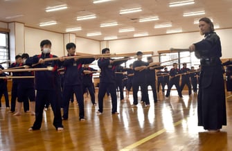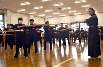 色麻町にある加美農業高(川上剛弘校長)は、体育の授業に日本発祥の現代武道「銃剣道」を取り入れた。体験授業が10日に行われ、1、2年生が実技に挑戦した。体育の授業に銃剣道を導入するのは、全国の公立高校で初めてという。銃剣道は、フランス式銃剣術に槍術の技法を取り入れた日本式銃剣術が起源。長さ166㌢の木銃で、相手の左胸や喉などを突いて勝敗を競う。2012年から中学校で武道が必修化され、柔道や剣道、相撲から1競技を選んで学習しているが、高校では選択制となっている。そこで同校は昨年、体育教諭が武道指導者研修会に参加したこともあり、生徒の多様な興味、関心に応えようと武道を導入、中学で経験していない銃剣道を取り入れた。この日、講師を務めたのは全日本銃剣道連盟事業部次長の衛藤敬輔さんとフランス出身で国際武道大の学外講師、バティスト・タベルニエさん。授業は1、2年生別に行い、1年生は55人が参加。基本動作の練習や模範試合を見学したほか、実際に木銃で新聞紙を突いたり、バレーボールを突いて転がし、水の入ったペットボトル6本を倒す「銃剣道突きボウリング」というゲームを行ったりした。