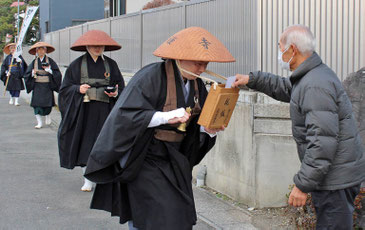 大崎地方の曹洞宗寺院若手僧侶でつくる県曹洞宗第9教区青年会(会長・青木崇玄妙伝院副住職)は18日、大崎市古川福沼などで「歳末助け合い托鉢」を行った。参加した青年僧10人は寒風が吹く中、住宅街などを行脚して市民から浄財を募った。この日は晴れたものの、肌を刺すような冷たい風が吹く寒い一日に。僧侶たちは檀家らに見守られながら龍洞院(古川江合本町)を出発。読経しながら住宅地や富光寺(古川李埣)、宮城誠真短大前など約5㌔を行脚し、携えた鉢や首にかけた餉箱に浄財を受け取った。住民たちは僧侶の鳴らす鈴の音が聞こえると、沿道に出て「ご苦労さまです」と声を掛けながら寄金し、一人一人に手を合わせて見送った。