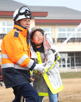 地域防災を支える消防団について学ぶ授業が17日、美里町北浦小(佐藤浩人校長、児童数95人)であった。3年生11人が町消防団(木村常雄団長、団員数416人)から話を聞いて活動内容を学習したほか、放水も体験した。児童の防災意識向上を促すのが狙い。同小学校区の防火、水防を担う町消防団第4分団を中心に、団員12人を講師に招いた。