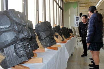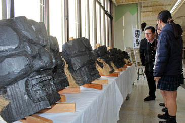 古川工業高建築科の生徒が制作した釜神様を披露する「釜神展」が、JR古川駅新幹線改札内コンコースで開かれており、憤怒の顔をした作品が駅利用者をお迎えしている。来年1月8日まで。釜神様は火伏せ、魔よけの神で、宮城県北から岩手県南に伝わる。釜神展は、学習成果の発表と釜神文化を広く知ってもらう目的で、2010年から毎年実施。課題研究「造形制作班」を選択した3年生が取り組んでいる。ことしの造形制作班は13人。加美町文化協会木彫りの会の小野惇夫さんの手ほどきを受け、6月から制作。堅いケヤキ材に四苦八苦しながらも、のこぎりやのみを使って少しずつ彫り進め、約4カ月で完成。縦約50㌢、横約40㌢の作品に仕上がった。コンコースの一角には、生徒の力作13点に小野さんと同科OBの作品を合わせた計15点を展示。釜神様の風習や制作過程を解説するパネルも設置した。