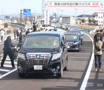 大崎市古川中心部を避けて東部と南部を結ぶ「国道108号古川東バイパス」(延長約5・1㌔)が21日、全線開通した。開通式典と通り初めが行われ、関係者や沿線住民らが事業着手から35年越しの供用開始を祝福。国道108号の混雑緩和や交通事故減、救急搬送迅速化、地域産業振興といったさまざまな開通効果を期待した。古川東バイパスは、国道108号が古川鶴ケ埣で分岐し、古川稲葉の国道4号鴻ノ巣交差点に接続する全線2車線(暫定)。1990年に事業化、95年に用地取得が始まり、2007年度に着工した。総事業費は340億円で、うち用地費は87億円。