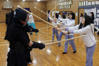 教育旅行の一環で宮城県を訪れている台湾・台北市の高校生が19日、古川高で同校の生徒と交流した。生徒たちは互いに英語や翻訳アプリなどを使い、言葉や国籍の壁を越えて親交を深めた。教育分野における関係強化などを目的とした台北市政府教育局主催の取り組みで、県と台北市が2024年4月に交わした「教育旅行促進に向けた覚書」に基づくもの。古川高との交流は同年7月に続き2度目で、ことしは台北市成淵高級中学(成淵高中)の生徒22人が教職員や教育局職員と共に訪れた。成淵高中の生徒たちは古川高の2年生有志36人による歓迎を受けた後、剣道と琴を体験。このうち剣道では、部員の指導で礼や素振りなどを練習した後、打ち込みに挑戦。当初は遠慮がちに竹刀を振っていたが、「痛くないから思い切り打って」という顧問の指導を受け、「めーん」と声を張り上げて防具を着けた部員の面を打っていた。
