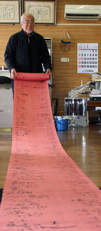 大崎市岩出山の書家で、宮城書芸院会長を務める加納鳴鳳(本名・雅弘)さん(72)は22~25日の4日間、「腎臓移植50周年」を記念した書展を仙台市宮城野区の東北福祉大ギャラリーミニモリで開く。自身最後の個展とし、開催日ぎりぎりまで作品を書き続けている。加納さんは3歳でネフローゼ症候群を発症。20歳のとき、早稲田大野球部の練習中に慢性腎不全で倒れた。1974年2月に母親のミネ子さんがドナーとなり、東北大病院で21例目の生体腎臓移植手術を受けた。移植後、50年以上生存している患者は東北では加納さんのみ。書家の津金孝邦さん(1929~2021年)に師事し、日展で38歳から2年連続入選するなど、県書道界の第一線で長らく活動してきた。個展は20年に開いた移植45年展以来で、巨大紙を使った詩文など60点余りを披露する。