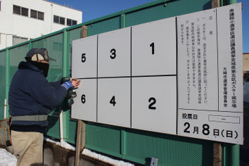 27日に公示される衆院選のポスター掲示板の設置が、急ピッチで進められている。大崎市内では22日から作業が始まり、市選管によると公示ぎりぎりまでかかりそうだという。市選管によると、市内のポスター掲示板設置箇所は、昨年10月の知事選と同じ361カ所。仙台市内の製作会社に製造を発注し21日に納入を受け、翌日から業者が設置を始めた。23日は往来が多い大崎市古川駅前大通の幹線道路沿いで、業者が設置作業を進める姿が見られ、電動ドリルを使ってねじを打ち付け、掲示板を支柱に固定していた。